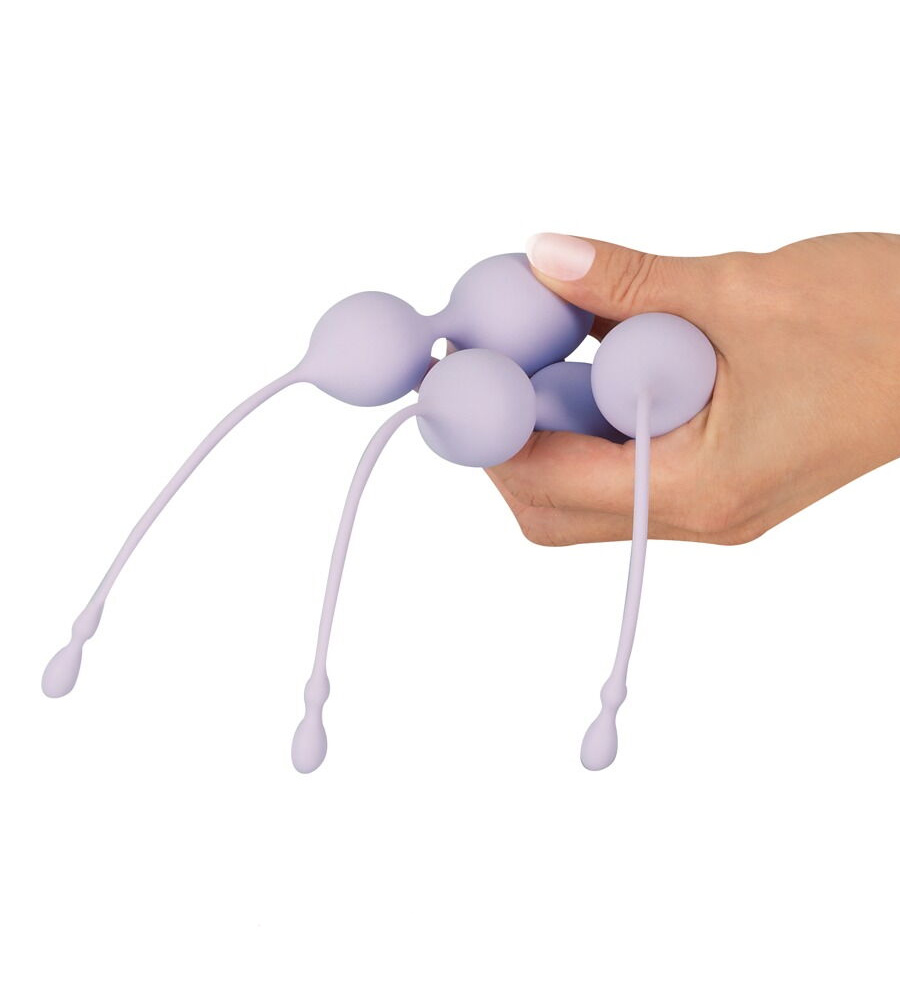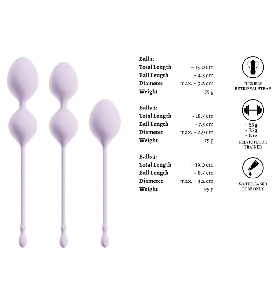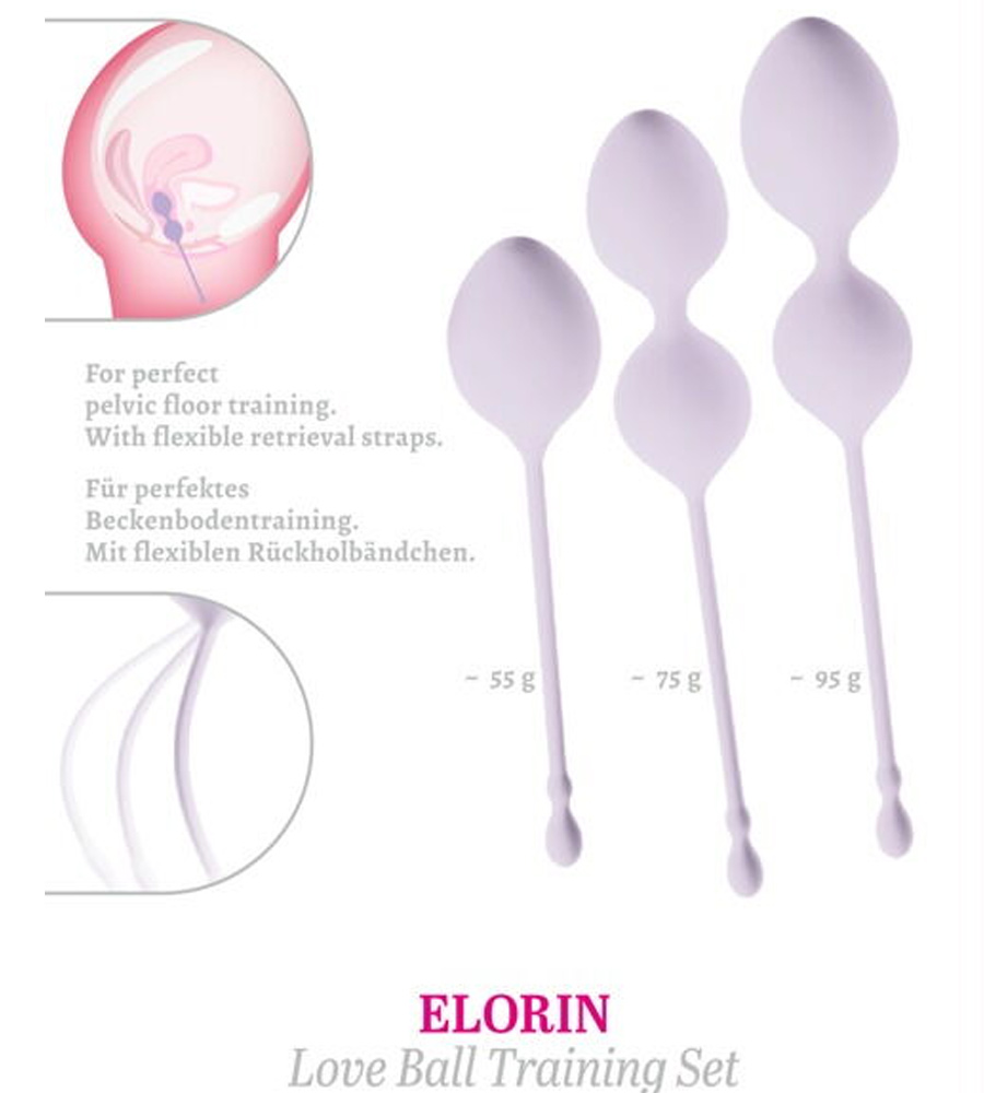 Sve kuglice imaju rastezljiv končić za izvlačenje (duljine 10,5 cm) za jednostavno i sigurno uklanjanje. beau coeur ELORIN Love Ball Set izrađene su od baršunasto mekog silikona za maksimalnu udobnost tijekom diskretnog treninga mišića dna zdjelice.