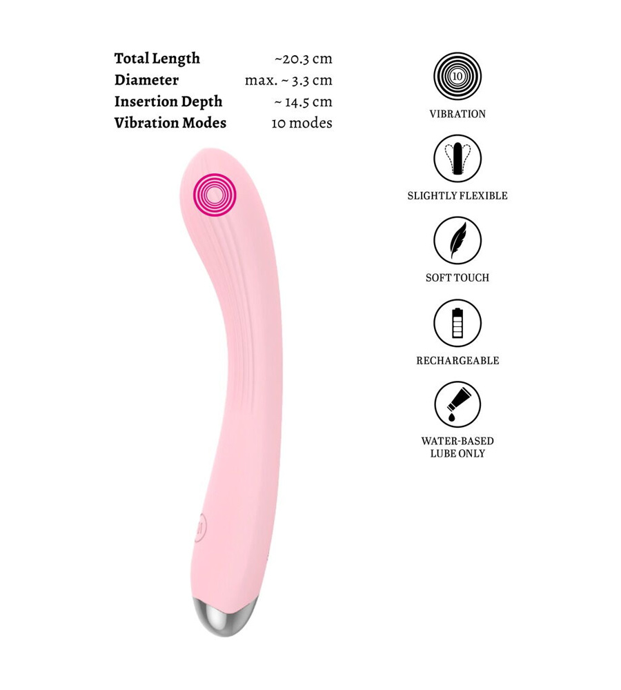 Nježno je zakrivljen te vas potiče na igru – solo ili u paru. Ima 10 svestranih načina vibracije kojima se upravlja pritiskom na gumb. Od senzualnih do intenzivnih vibracija, savršenih za sve preferencije. Elegantna tekstura dodatno pojačava stimulaciju za intenzivno iskustvo.