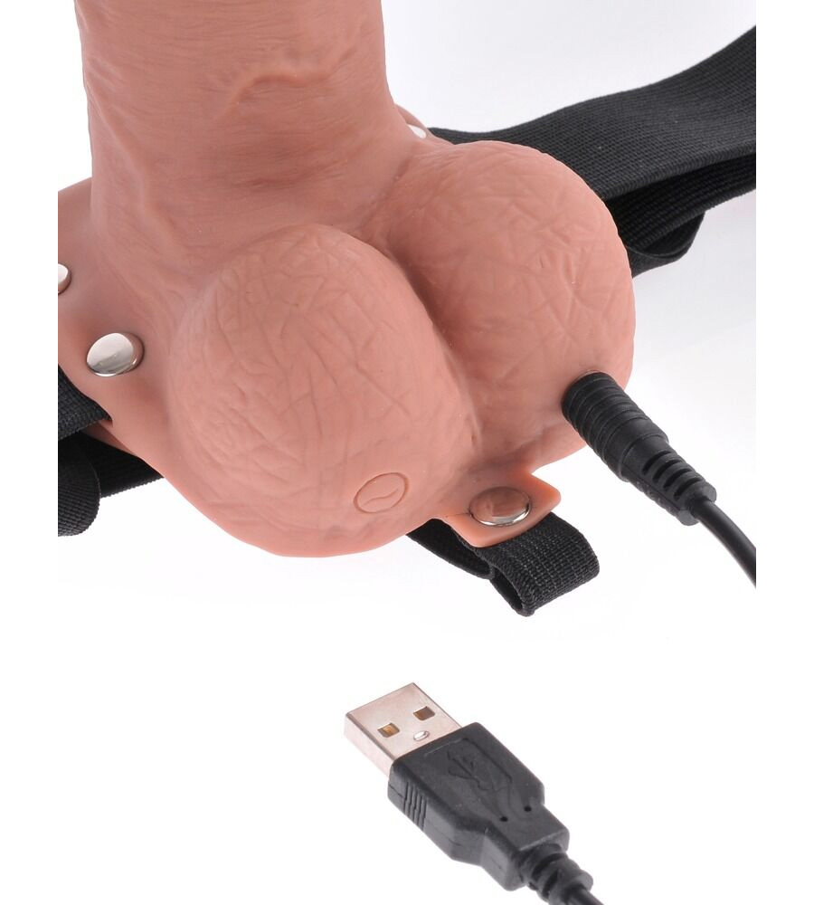 Uvijek čvrst i spreman za akciju! Ovaj realistični šuplji strap-on vibrator s izraženim glavićem i testisima pruža intenzivan užitak i fleksibilnost u igri za oba partnera.