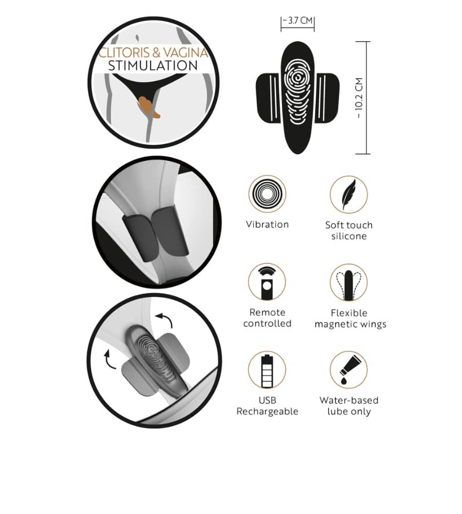 Daljinski upravljač je jednostavan za korištenje te postoji 10 razina tihih, ali snažnih vibracija. Vibrator je iznimno diskretan što znači da nitko neće znati da se nosi, a kako je vodootporan može se koristiti u kadi ili pod tušem.