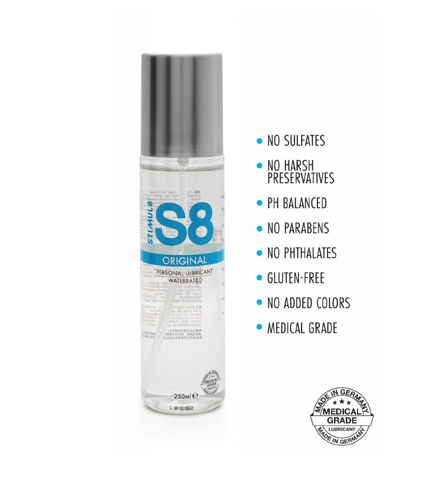S8 Waterbased Lube 250ml je vrhunski lubrikant na bazi vode koji hidrira i regenerira sluznicu. Bez boje, mirisa i okusa te se posebno ističe izrazitom izdašnošću. Dovoljan je samo tanki sloj lubrikanta za dugotrajnu lubrikaciju i trenutni osjećaj olakšanja i ugode. Vaša koža će biti mekana i svilenkasta – umjesto da bude mokra ili “klizava”.