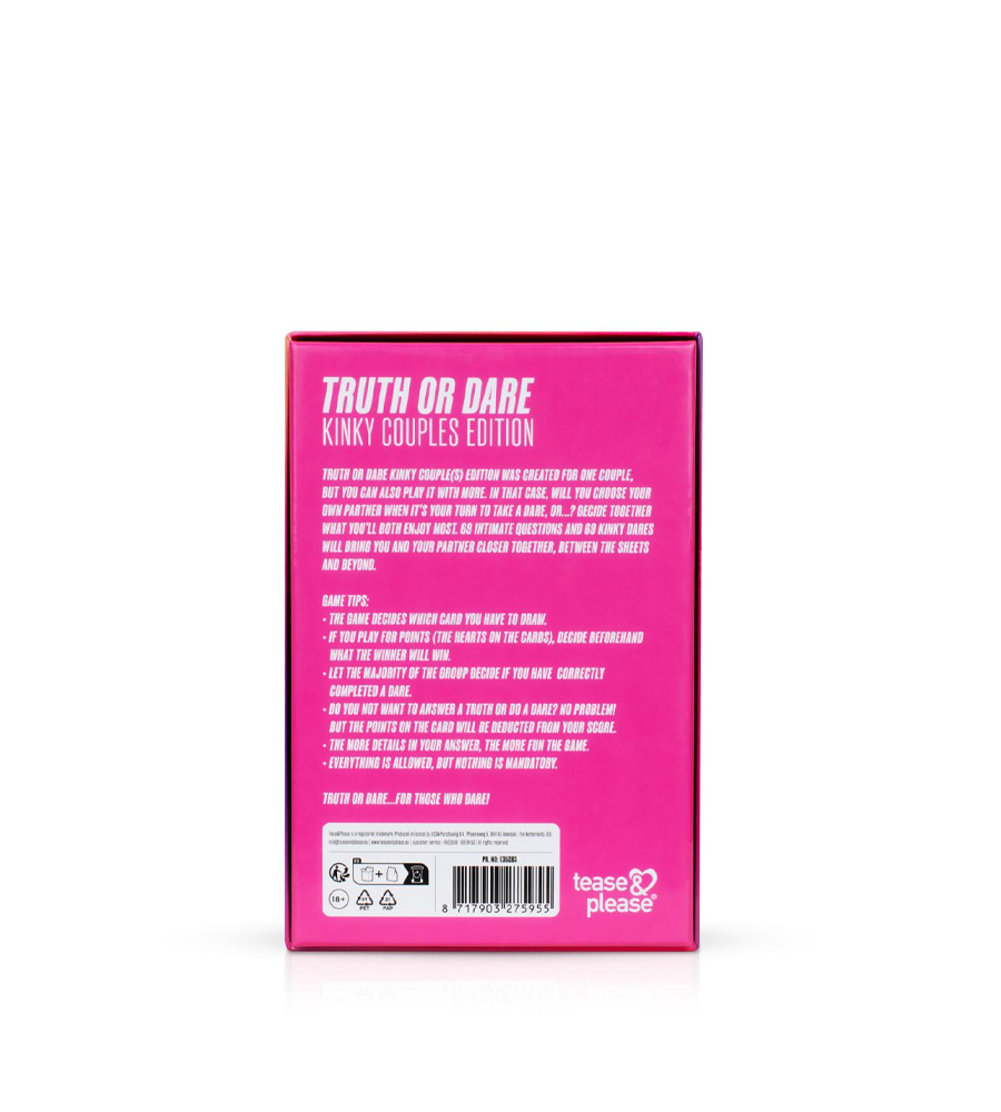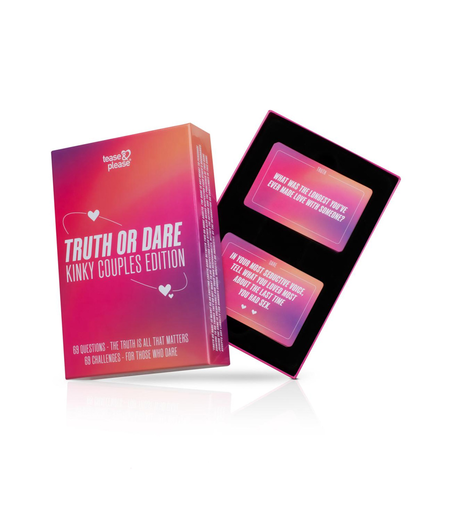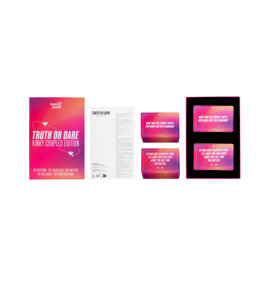 Truth or Dare Kinky Couples Edition sadrži 69 odvažnih pitanja i 69 hrabrih izazova – ova igra stvorena je za zabavu, zavođenje i razigranu intimnosti. Savršena za stvaranje novih iskustava, sami ili s drugima. Sjajan dar za avanturističke parove koji žele začiniti svoju vezu.