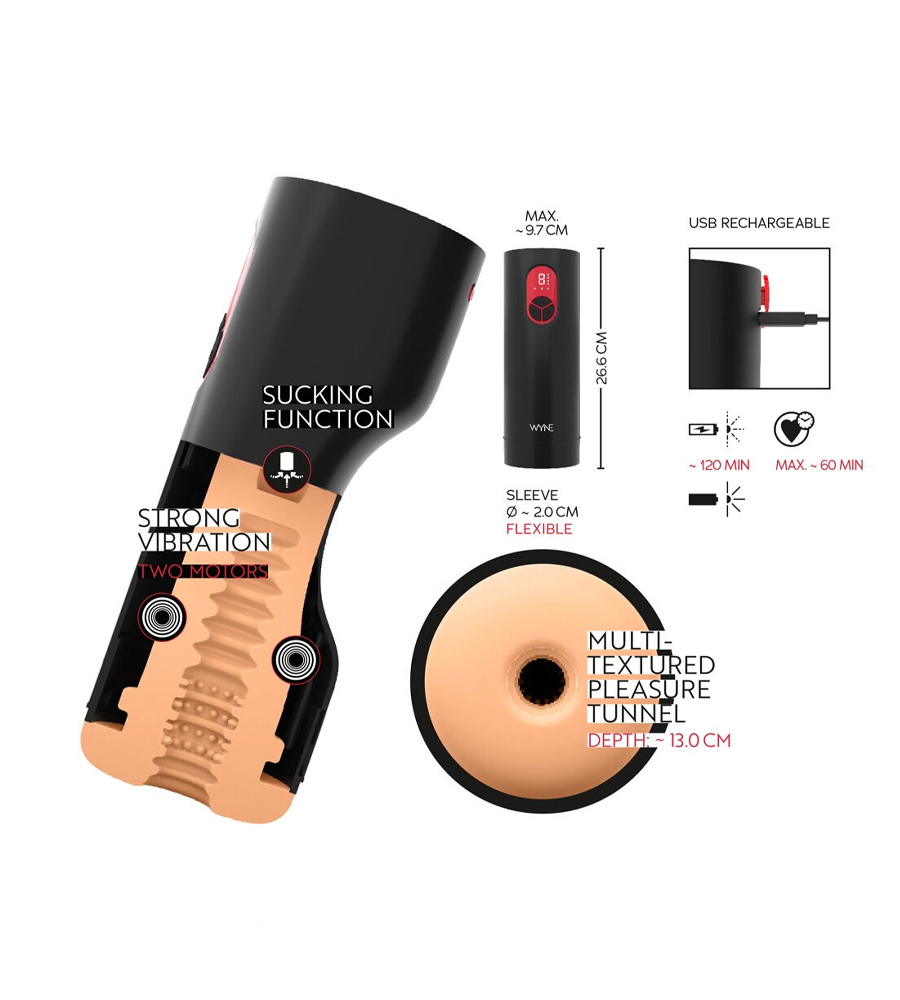 WYNE 07 je masturbator s 2 motora i luksuznim kućištem koje odlično pristaje u Vašu ruku. Mekana elastična navlaka unutar kućišta točkaste je teksture koja pruža intenzivnu stimulaciju penisa.