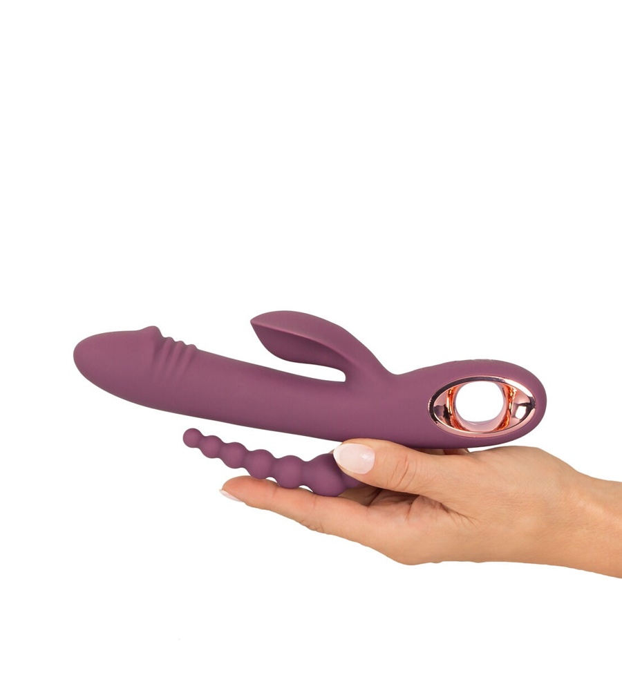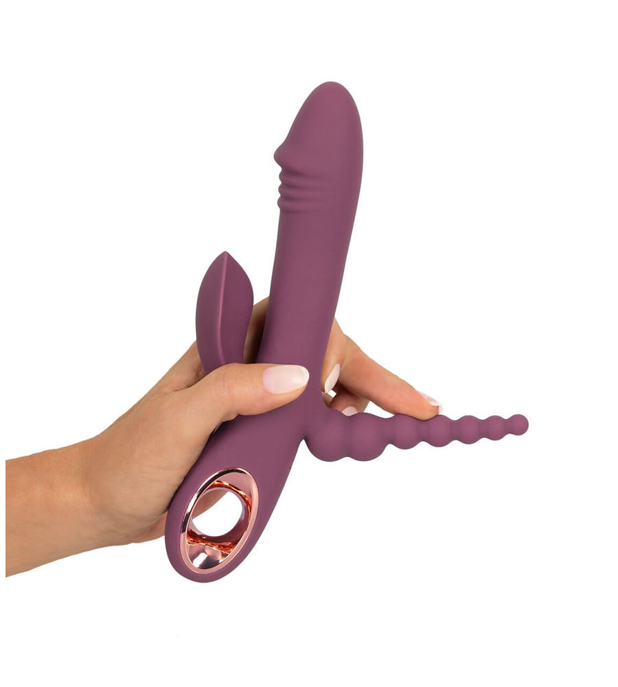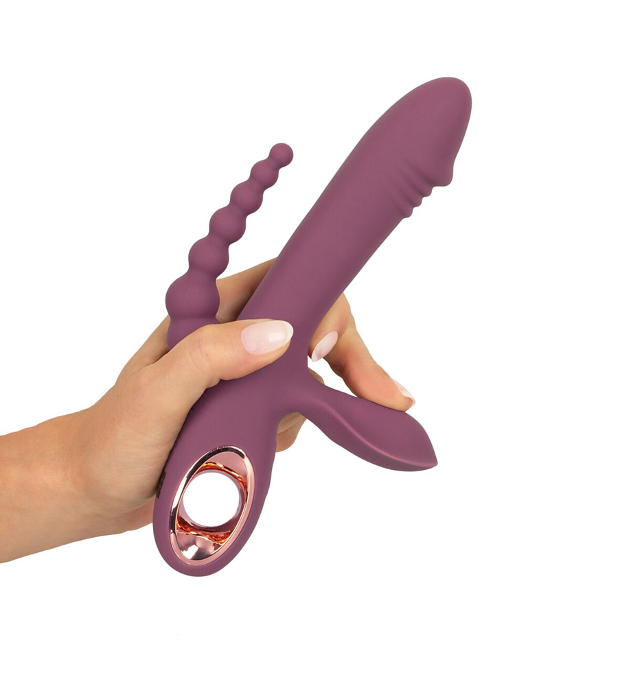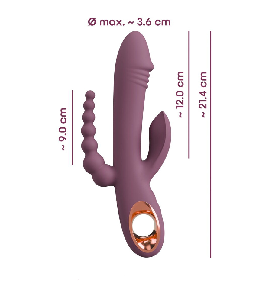 Ergonomski oblikovan, izrađen od baršunasto mekog silikona, lako se umeće i pruža iznimno ugodan osjećaj. Fleksibilan je, pa se savršeno prilagođava tijelu i njegovim pokretima tijekom igre. Nježno zakrivljen s teksturiranom glavicom pruža potpuno vaginalno zadovoljstvo i preciznu stimulaciju G-točke. Meki, zakrivljeni stimulator klitorisa cilja vanjsku erogenu zonu, dok fleksibilni analni stimulator ima završetak s kuglicama: počinje manjom kuglicom za lako umetanje, a zatim se kuglice povećavaju kako bi pružile pojačanu stimulaciju pri svakom pomaku. Kada se vibrator s tri kraka u potpunosti umetne, može se koristiti i bez upotrebe ruku – dovoljno je samo opustiti se i uživati!